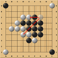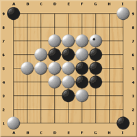 The goal of Regoot is to form an unbroken row (horizontally, vertically or diagonally) of 9 discs of player's color (for 11x11 or 13x13 boards a row should contain 11 or 13 discs respectively). If the board is filled up without any player achieving the goal then the game ends by a draw. |