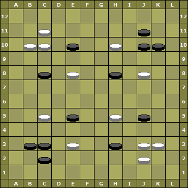 Ein Spielstein darf auf jedes Feld bewegt werden, das durch eine Abfolge von Feld-zu-Feld-Schritten erreicht werden kann. Die Höchstzahl der Schritte wird durch die im Spielstein steckenden Stifte begrenzt. Die Anzahl der weißen Stifte gibt die Höchstzahl der senkrechten Schritte an. Die Anzahl der schwarzen Stifte gibt die Höchstzahl der waagerechten Schritte an. Ein Spielstein ohne Stifte darf nicht bewegt werden. Ein Spielstein darf nicht über ein Feld gezogen werden, auf dem sich ein anderer Spielstein beliebiger Farbe befindet. Der Spielstein eines Gegners wird geschlagen, indem der Spieler den Spielstein des Gegners vom Brett entfernt und seinen Spielstein auf dieses Feld setzt. |