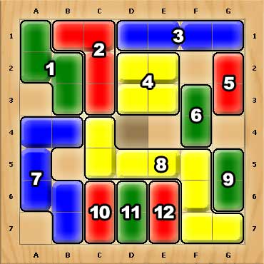 La lasta peco estas flava. La sekva peco ne povas kovri iujn el la ĉeloj kun "x". Se la sola ebla movo de ludanto estas meti pecon apud la lasta peco metita de la kontraŭulo, tiam la ludanto pasas, kaj la kontraŭulo rajtas meti denove. Tiukaze, la kontraŭulo rajtas meti ien ajn, ĉar ne estas last-metita peco por eviti. La ludo finiĝas kiam neniuj pluaj pecoj meteblas sur la tabulon. |