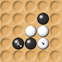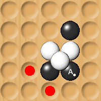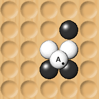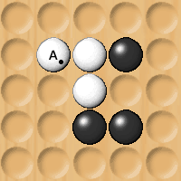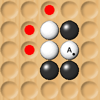 "B" en "C" zijn verbonden want ze liggen op orthogonaal aangrenzende cellen. Twee stenen zijn verbonden als er zich een ononderbroken pad van verbonden stenen tussen hen bevindt. Echter, indien een verbinding over een verbinding van de tegenspeler ligt, telt alleen de bovenste. De onderliggende verbinding geldt als onderbroken, totdat de bovenste weer verbroken wordt.