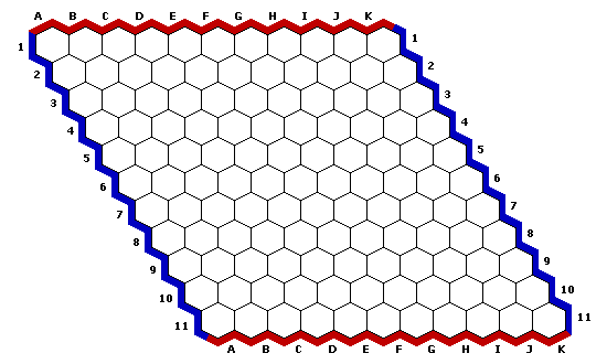 Целью игры Некс является построение неразрывной цепочки из камней своего цвета, соединяющей противоположные стороны доски, окрашенные в соответствующие цвета. |